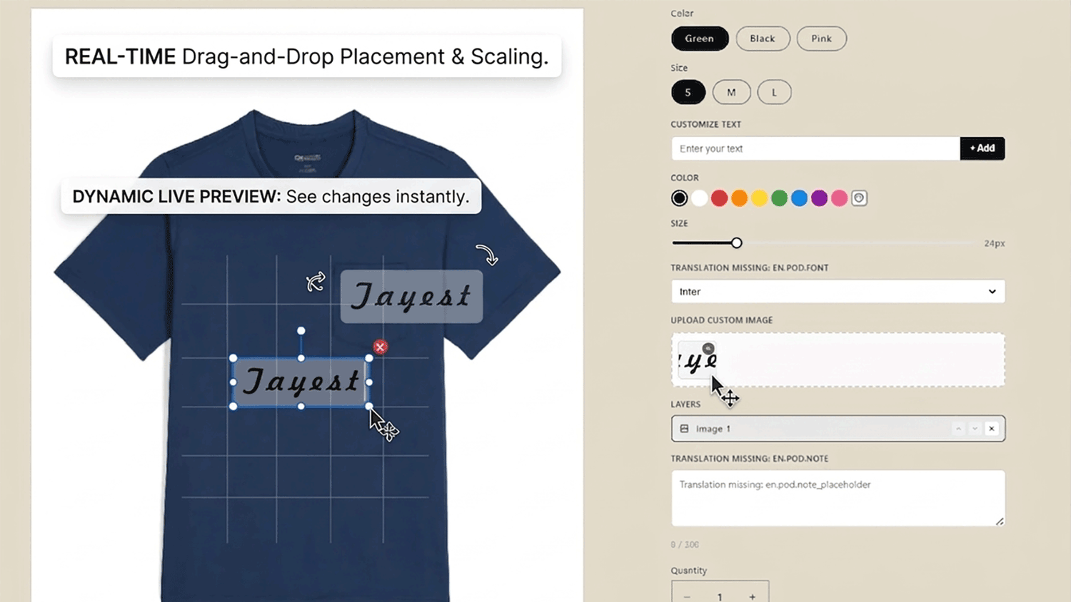 Boost customer confidence and reduce returns with our real-time customization engine. Shoppers can upload images, add text, and adjust designs via drag-and-drop directly on the product page. What they see is exactly what they get.